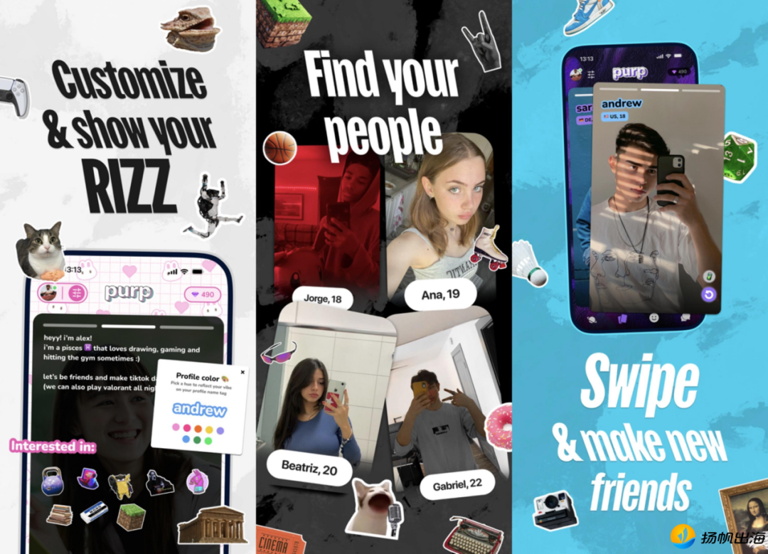 Purp上线于2021年,在玩法上与Peeps有一定相似性,但其用户分布并没有集中在社交成熟的美国,而是分散在欧美、拉美、东南亚等地,受众更加广泛,也让东西方的用户之间基于兴趣爱好的一致性,在线上快速建立联系。
