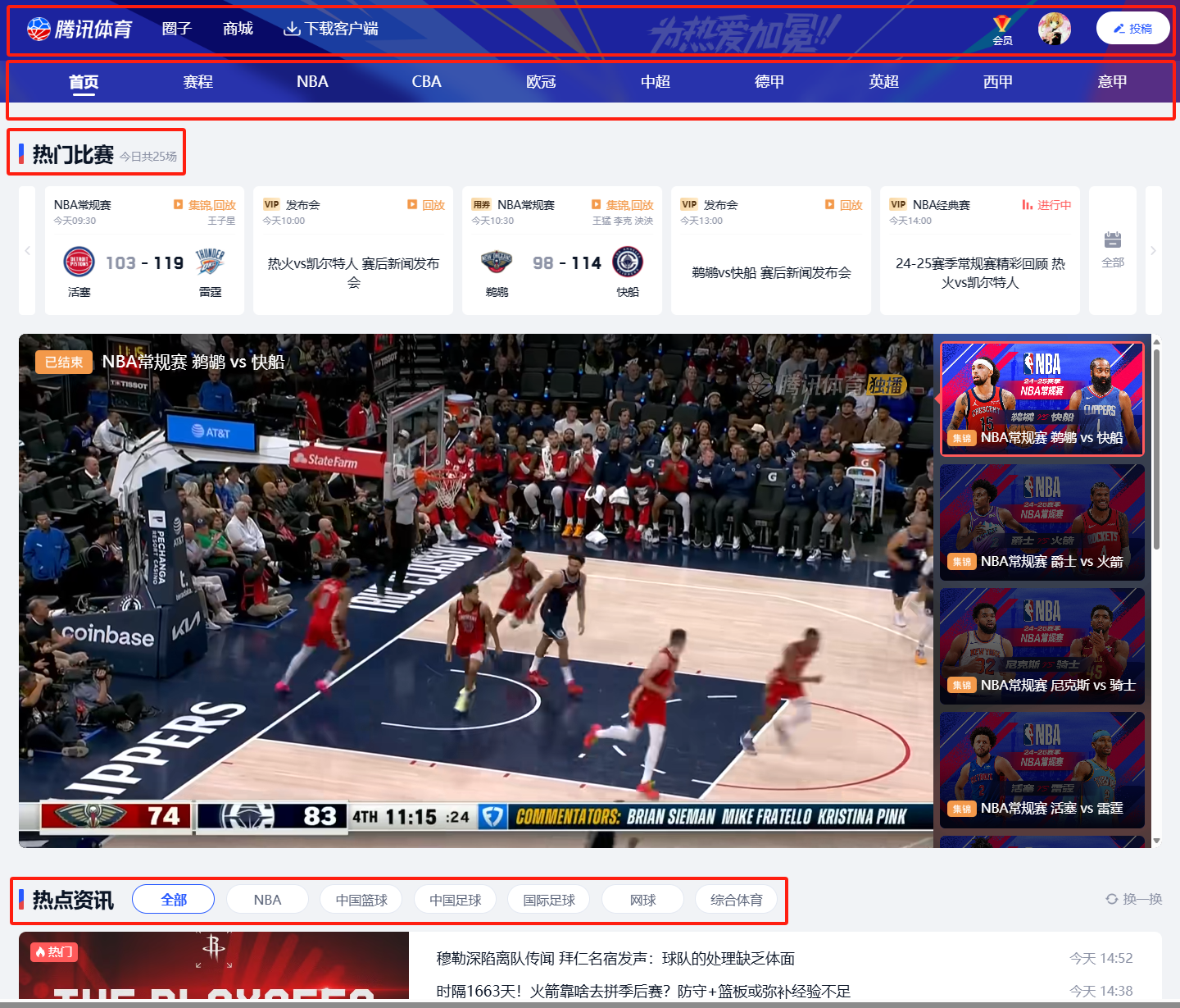 按照模板的信息作用层级关系 功能导航 > 赛区Tab > 热门比赛 >热点咨询,所以腾讯体育按照从上往下的层级关系展示,清晰明了。