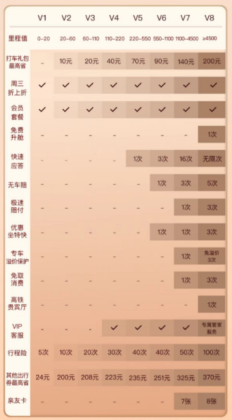 基于此,将会员权益边界向外延伸,与酒店、旅游等外部平台开展合作,成为滴滴的必然选择。目前滴滴会员体系共设8个等级,其中V1至V3等级几乎无实质权益;从V4等级开始,用户可解锁华住会银会员权益;随等级进一步提升,还能逐步获得亚朵、希尔顿等酒店的对应等级会员资格,以及海底捞会员权益、机场与高铁贵宾休息室使用权等跨场景福利。