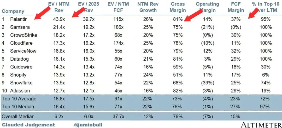 2024年不仅股价至今上涨超300%,市值一度突破1700亿美元,ARR年订阅收入预测倍数(EV (Enterprice Value)/NTM Rev (Next Twelve Month Revenue)即企业估值/企业当年收入)蹿升美国SaaS公司榜首,接近44 倍。