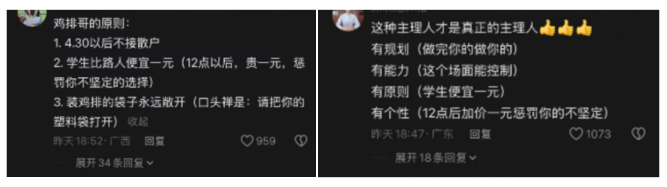 这种情感投入的商业回报,是实打实的用户粘性和自发传播。据他讲述有很多顾客是 “每周均消费 2 次以上” 的常客,72% 的用户曾发布过与他相关的内容 —— 有人拍他炸鸡排时的专注,有人剪他和顾客的对话合集。这些 UGC 内容没有花哨的剪辑,却带着真实的温度:比如有人整理了 “鸡排哥金句 TOP10”,“要等好久吗?不需要”“物超所值的 6 块” 等句子成了粉丝间的暗号。对地摊生意来说,这种 “用户主动替你说话” 的传播,比任何付费推广都更有效 。