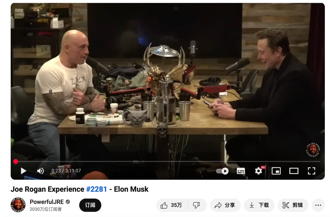 9月24日,360公司董事长周鸿祎做客罗永浩的播客节目,与其对谈AI,再次引发讨论。这些名嘴+明星嘉宾的视频播客节目,也让不少人看到了中文播客对标国际头部的可能:美国“播客之王”Joe Rogan的同名节目,访谈对象覆盖特朗普、马斯克等全球顶流,仅在YouTube平台的订阅数就突破2000万,影响力早已超越普通播客节目的范畴。