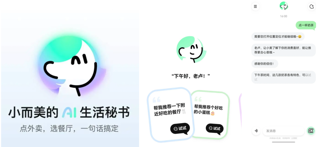 小美AI生活小秘书是美团首款AI Agent产品“小美”App,于2025年9月12日官宣开展公测。搭载了美团自研模型LongCat-Flash-Chat,通过简单的自然语言交互、内部接口调用,能够实现原生、丝滑的外卖下单、餐厅推荐、订座导航等本地生活服务体验。可根据亿级用户的真实交易、真实评价结合用户的喜好来下单。