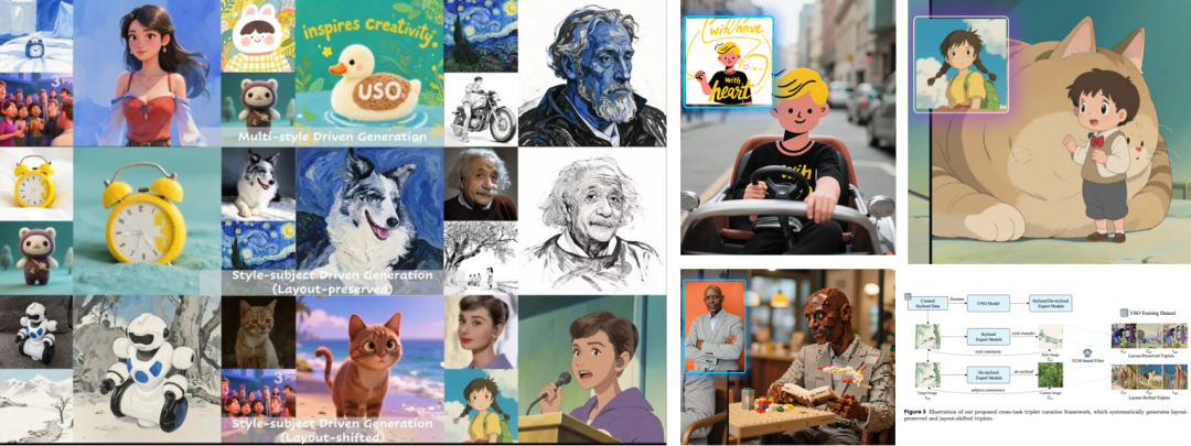 字节UXO团队设计并开源了统一框架USO,让看上去不关联的任务相互促进,实现风格迁移和主体保持单任务和组合任务的SOTA。USO通过单一框架能统一之前那些看似孤立的任务包括主体、身份保持和风格化编辑,参考图风格迁移,同时保持主体和风格参考,甚至更抽象复杂的多风格迁移,是实打实的六边形战士。