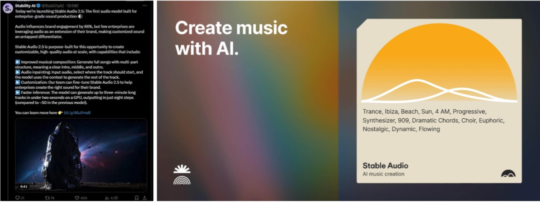 Stability AI推出新一代音频生成模型Stable Audio 2.5,颠覆创作流程。新模型两秒内生成三分钟完整音乐作品,在Nvidia H100 GPU上实现高速处理。精准响应”振奋人心”等情感指令,还原”丰富合成器声”等风格要求,创作含引子、发展和尾声的复杂乐曲。Stability AI与WPP集团旗下Amp达成合作,为全球客户打造专属音频标识,推动广告、零售领域音频应用。