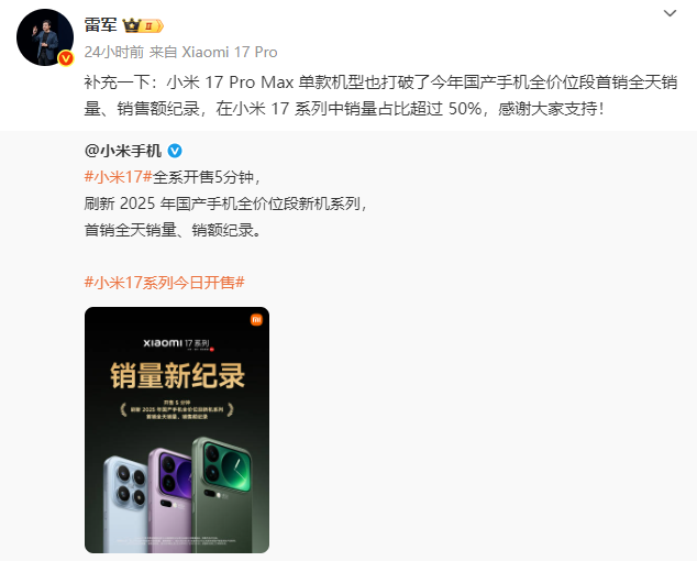 最终的市场反馈是检验一切对标举措的标准:9月27日10时,小米17系列全渠道开售,直接刷新2025年国产手机首销纪录。其中,得到雷军重点推荐的小米17 Pro Max,单款机型打破今年国产手机全价位段首销全天销量、销售额纪录,在小米17系列中销量占比超50%。