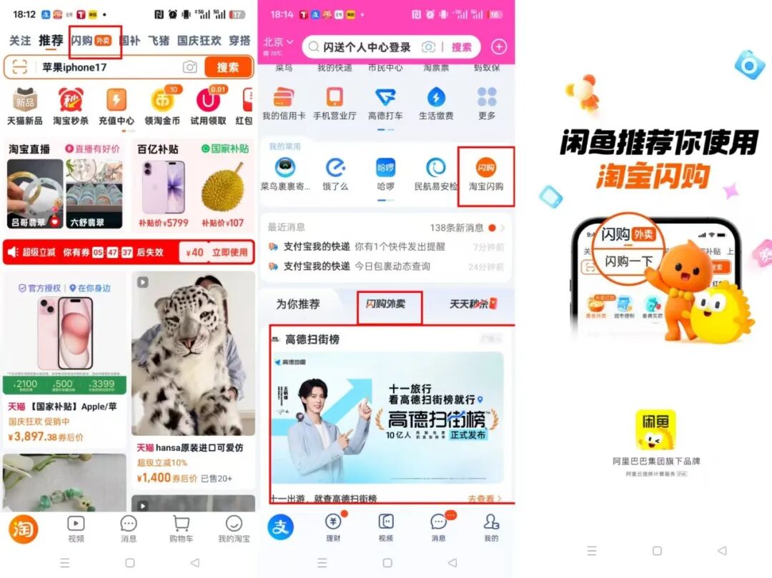 淘宝(月活9.2亿)首页开屏改为了“购物·外卖·旅行”,支付宝(月活过10亿)为淘宝闪购开了首页的一级入口,闲鱼(月活过2亿)则直接在开屏上为闪购代言——“闲鱼推荐你使用淘宝闪购”。