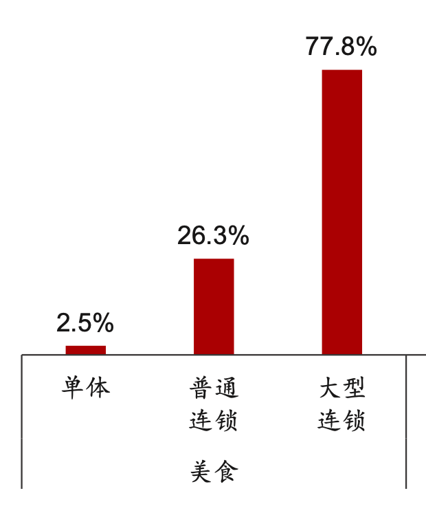 浙商证券曾在去年做过复盘,发现与达人合作的抖音生服餐饮商家中,大型连锁商家的占比高达77.8%,普通连锁商家占比26.3%,单体商家的占比低至2.5%。