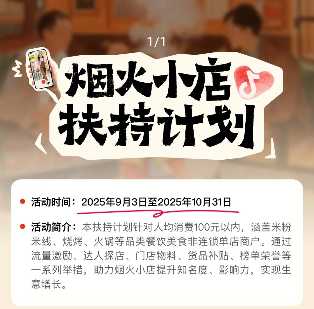 一来,今年9月10日,抖音生活服务宣布上线“烟火小店扶持计划”,试图通过流量激励、达人探店、门店物料、货品补贴、榜单荣誉等,让更多客单均价低于100元的线下中小餐饮商家在抖音拿业绩。