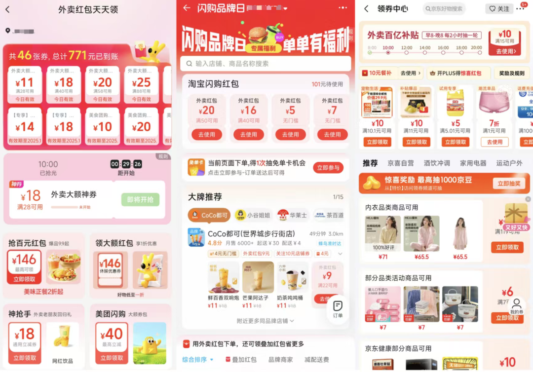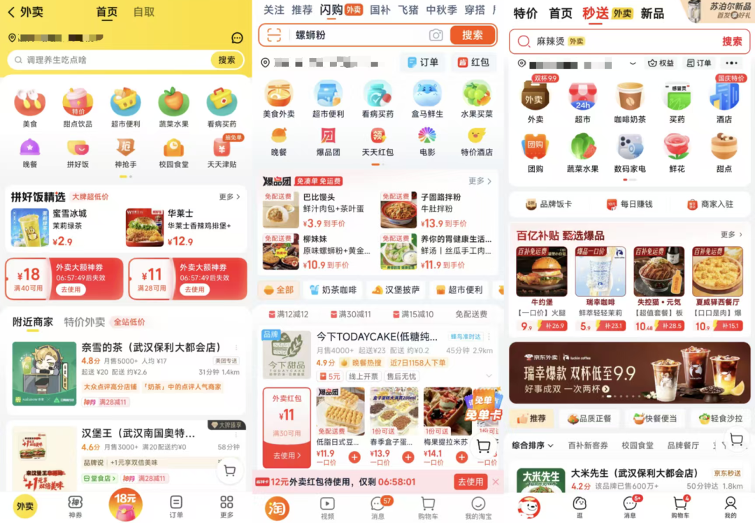 总体来看,淘宝和京东更强调“红包补贴”和“菜品丰富度”,力求在单个商家页面传递更多消费决策信息。而美团则更偏向“多店呈现”和“筛选效率”,突出品牌曝光与分类功能,便于用户快速浏览和选择。