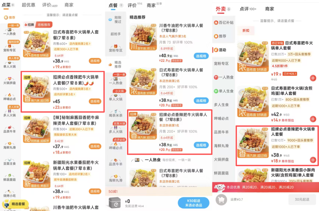 在餐食页面,我们选取的是店铺月销几百单的爆款套餐“招牌必点香辣肥牛火锅单人餐”,在基础的红包优惠之下,美团、淘宝闪购、京东的价格分别为23.5元、20.9元、18.9元,三者的配送费为1.4元、6元、1.2元。