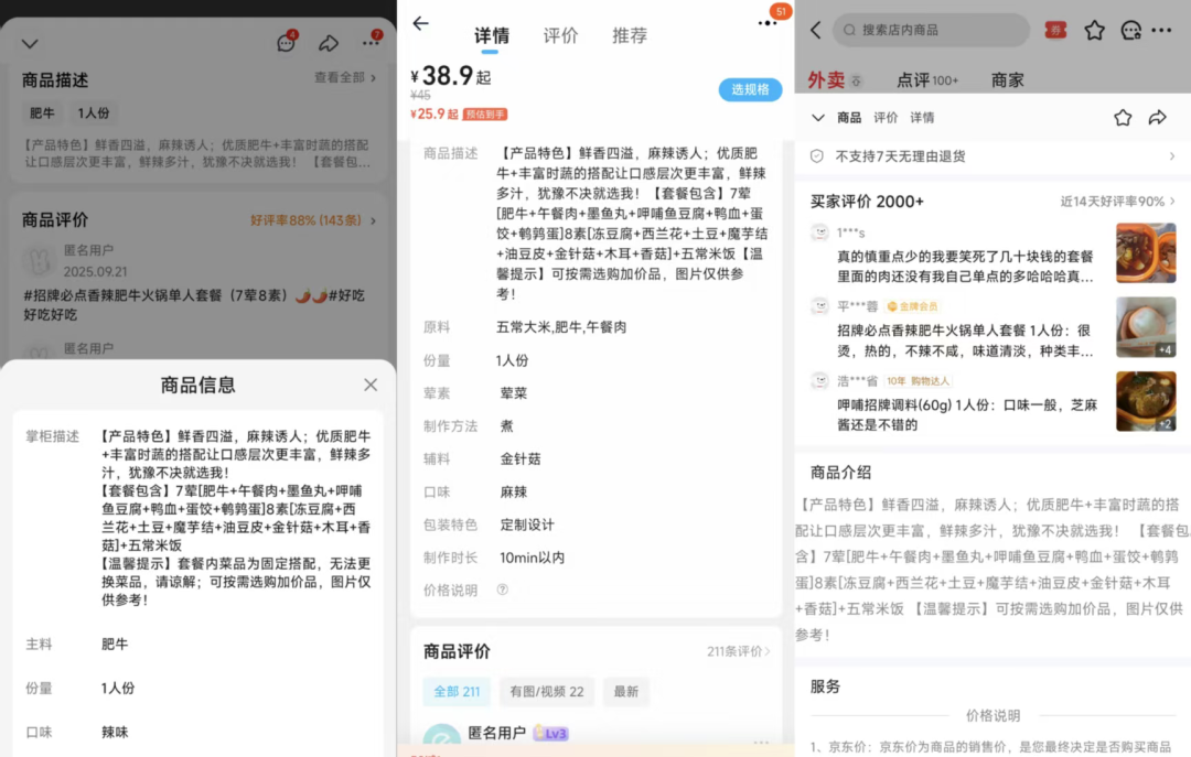 在商品详情页,三家的描述基本是复制粘贴的,不过美团稍微排版了一下,显得简洁一些。而淘宝闪购对餐品原料大概率是按占比来的,依次写着:五常大米、肥牛、午餐肉。