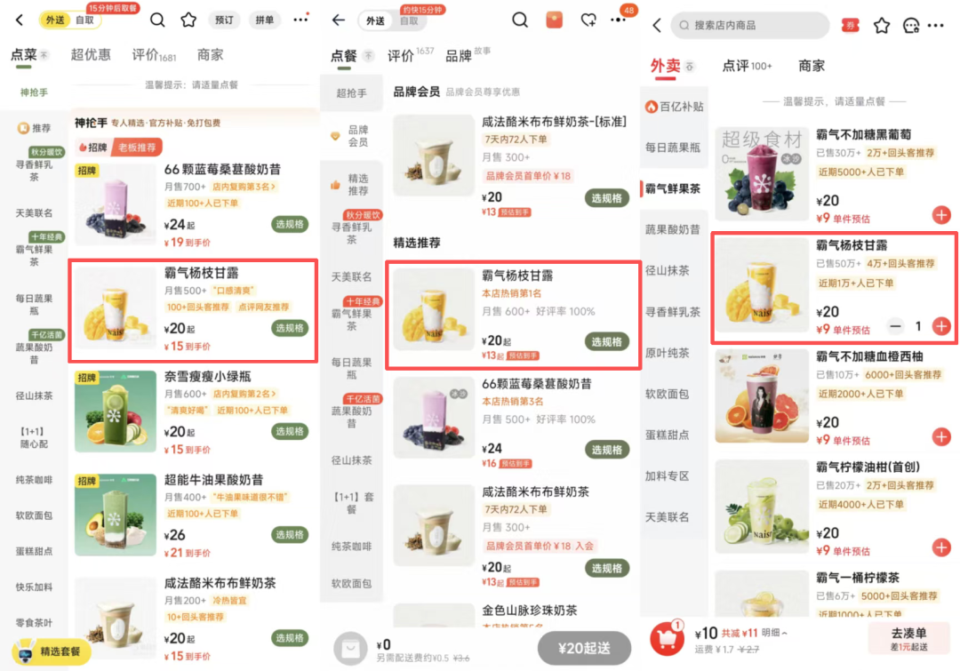 这次奶茶外卖测试,淘宝的配送速度突出,美团由于0.9元购买的大额红包优惠力度明显,京东平台优惠力度大,但是限制也相对较多。在茶饮赛道三家区别不大,更多还是在配送体系和价格上的差异。