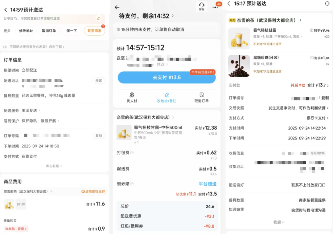 由于在中午饭点以后下的单,三家商品都在规定的时间内送达。美团的配送时间为14:26-14:57,用时31分钟,淘宝闪购配送时间为14:28-14:46,用时18分钟。京东的配送时间为14:30-15:14,用时44分钟。在买奶茶的外卖配送时长体验上,淘宝闪购第一、美团第二、京东第三。