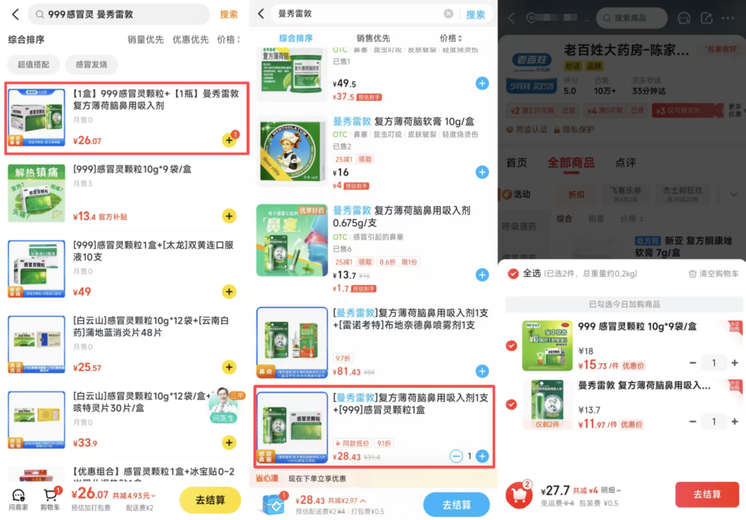 戏剧性的是,由于我们先在美团和淘宝闪购下单,在京东买药时曼秀雷敦鼻用吸入剂已经卖完,最后不得已换了一款价格稍贵的同品牌软膏。