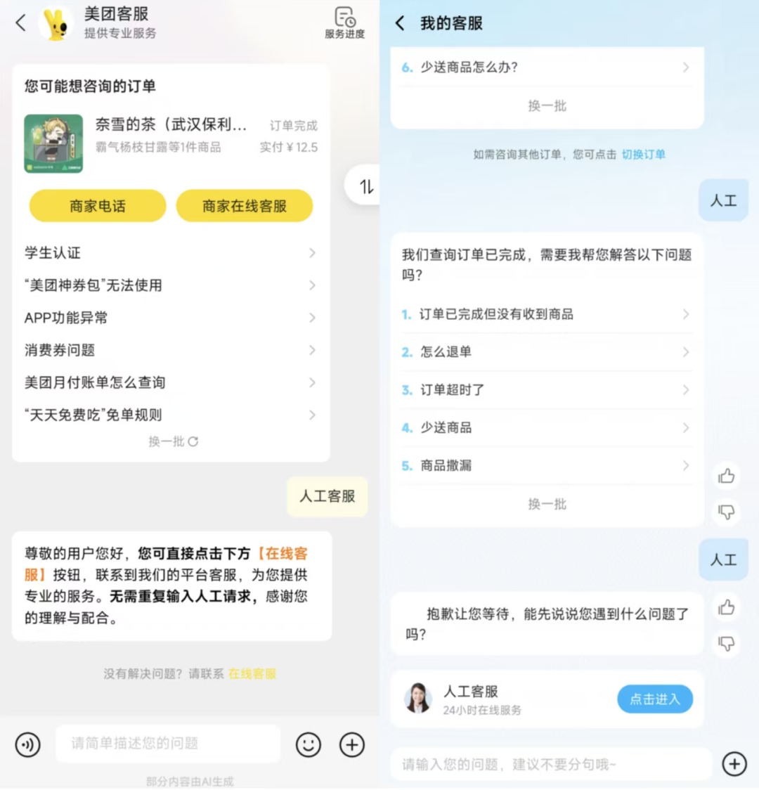 若选补送,需要电话商家协商补送;若选退款,选退款原因后,等商家处理。若需要客服介入,客服专员预计24小时处理,相比之下美团提供的可选项更多。
