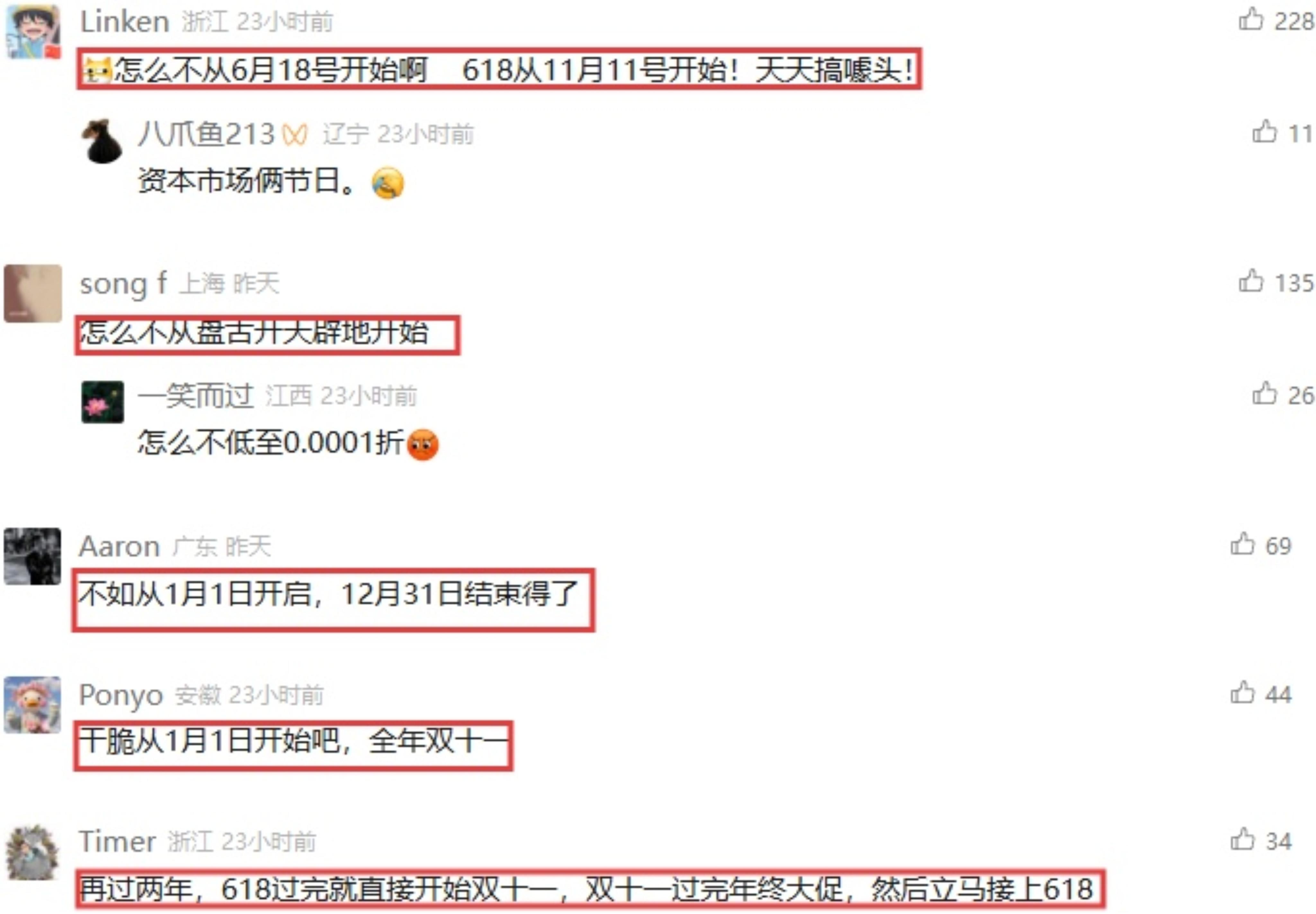 “怎么不从6月18日开始,618从11月11日开始!天天搞噱头!”“怎么不从盘古开天辟地开始。”