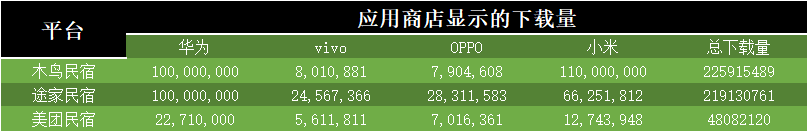 今年Q2国内出货量最大的四家手机厂商:华为、vivo、OPPO、小米四家厂商中,木鸟在华为和小米占据优势、途家在vivo和OPPO占据优势,总下载量仍然木鸟占优,途家以700万的差距略逊一筹,美团民宿则在安卓市场表现不佳。