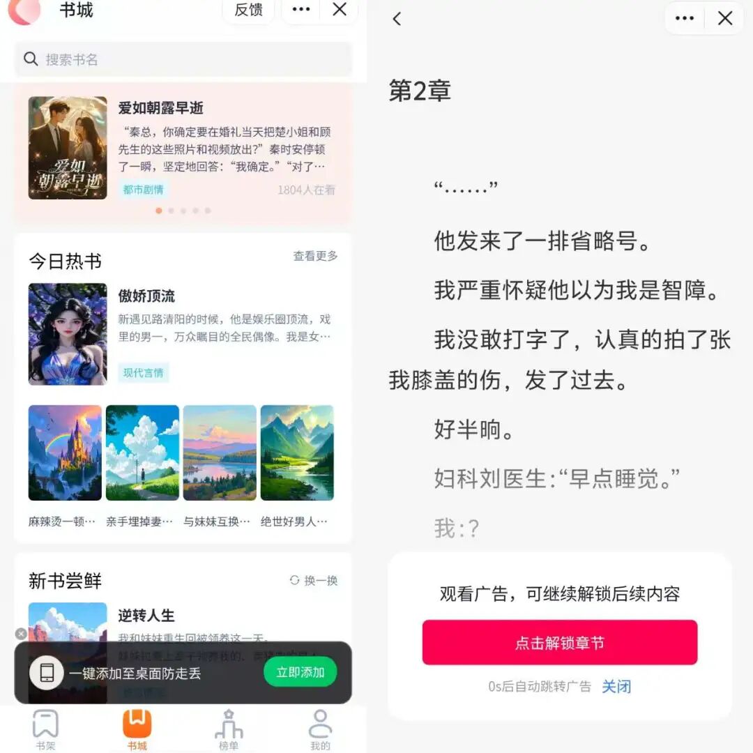 不过,字节短故事小程序的变现模式仍以广告为主。Tech星球体验后发现,用户阅读时,不仅解锁后续章节需要观看30秒广告,即便停留在当前阅读界面,每隔几秒钟也会自动弹出一段全屏视频广告,广告弹出时会打断阅读进度,需要手动关闭才能继续看书,频繁的广告干扰很容易让读者失去耐心,尤其对喜欢沉浸式阅读的用户来说,体验大打折扣。