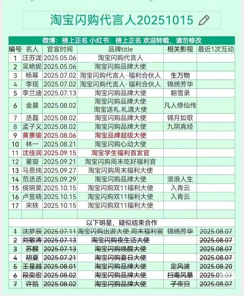 卷价格是主线,卷明星代言则成为这场持久战的副本。美团外卖签了黄龄、孙颖莎、陈哲远等明星;京东外卖找了雷佳音、张艺兴、李晟等明星。淘宝闪购陆续签了汪苏泷、吴艳妮、杨幂、李现等20多个明星。在明星代言的商战中,淘宝闪购主打一个“谁火签谁”(有热播作品或是人气持续上升),以短代的形式借助明星人气和热度完成“淘宝闪购”的品牌和低价优势曝光。