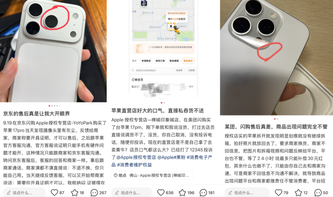 因为在iPhone17等众多电子产品的及时送达订单中,美团闪购、京东秒送以及淘宝闪购都出现了履约时效慢以及售后难等诸多问题。更有消费者发文吐槽,通过闪购/秒送下单的手机存在外观瑕疵或其他问题时,即便没有激活在退换货时均遭到阻碍。