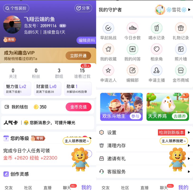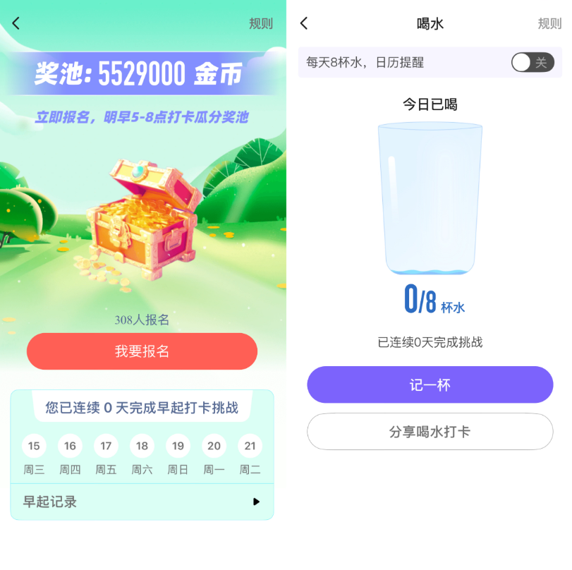 功能区,早起挑战、今日步数、喝水记录、相亲角、欢乐斗地主、天天养鸡,在线养花。