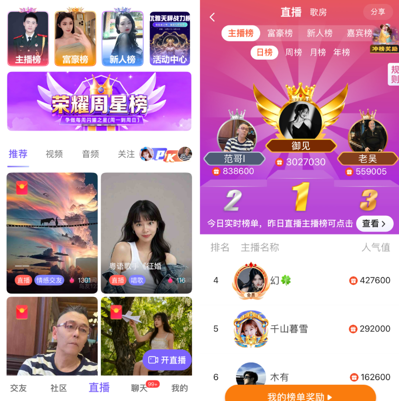 提供音频和视频直播两种形式,并且根据热度和收入进行榜单排名。