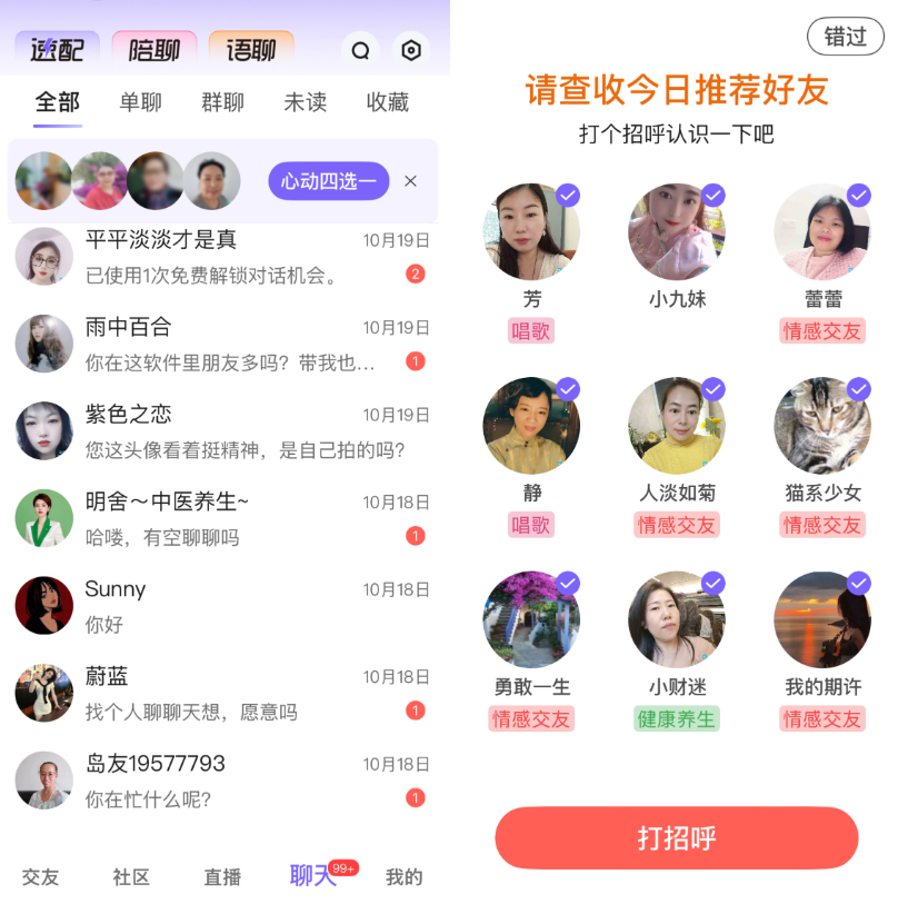 供速配、陪聊、语聊功能,还随机匹配心动阿姨,刚注册没一会,就有十几个“阿姨”主动聊天,一上来还不能直接视频,必须聊天或者送礼物,增加亲密度之后,才可以开视频。