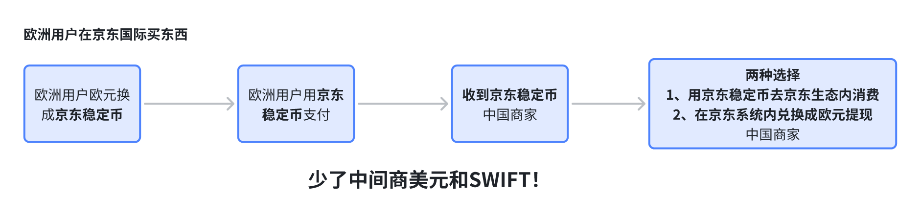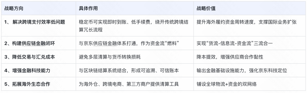 业务简介:京东发行稳定币,该币种锚定法币(如人民币或美元),旨在作为“数字化结算媒介”在京东内部生态与合作伙伴间流通,用于B2B采购、跨境支付、供应商结算等环节。