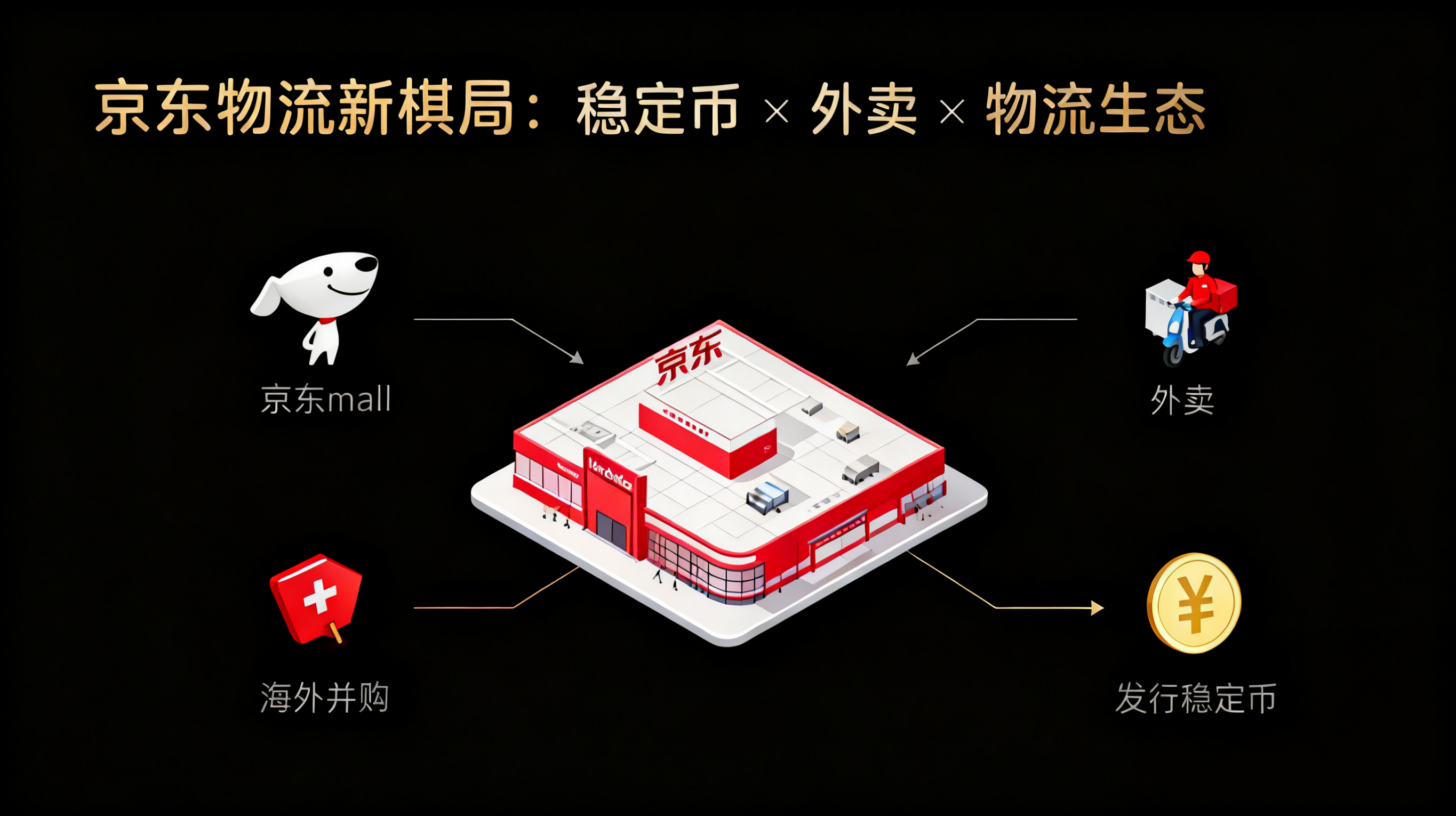 探讨京东在当前困局中通过稳定币、外卖、机器人等动作重新构筑物流护城河的意图与可行性。