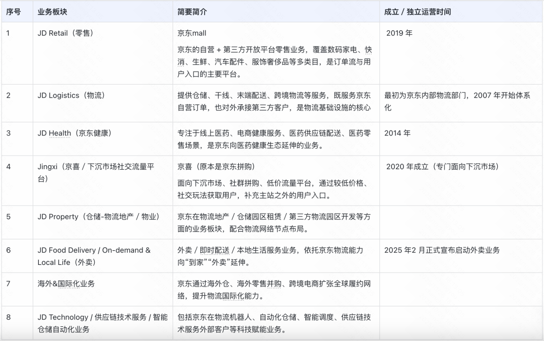 业务:京东外卖、达达即时配送 、京东到家(买菜业务),其中还包括京东“七鲜小厨”(餐饮加工 + 预制菜 + 即时达)