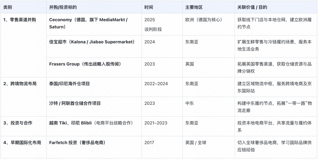 战略目的:在海外再建一个京东物流,弥补京东“国际化轻资产”的短板,获得本地仓、实体渠道和物流节点,降低跨境最后一公里与本地履约成本,形成“全球性供应链+本地履约”能力,从而对抗 Temu / Shein 的轻资产模式与 Amazon 在欧洲的地位。