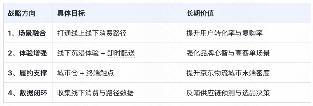 - 新流量增长:把用户日常刚需(吃、买)纳入京东的生态,增加流量与粘性;
