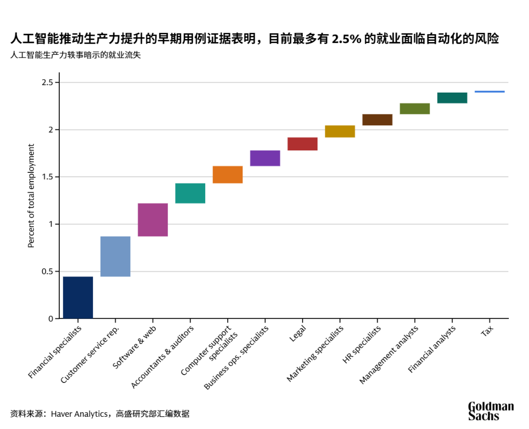 高盛公司在2025年初的一份报告中就曾预测,全球范围内,AI最终可能替代相当于3亿个全职工作岗位,其中行政、法律、管理等白领岗位受冲击最为严重(如下图所示)。