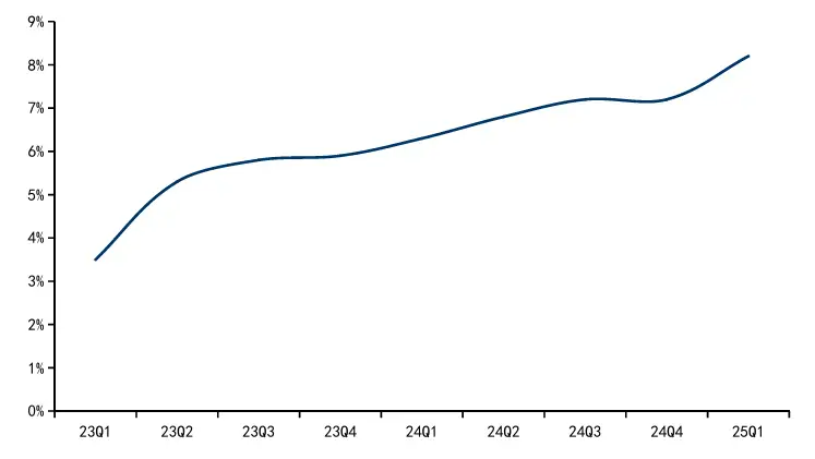 医药品类则更多体现为“渠道效率”的变革。今年第一季度,全国新开药店7118家,闭店10284家,净减少约3000家。但据中康CMH数据,药店O2O渠道占比已从2023年第一季度的3.5%上升至2025年第一季度的8.2%。一些借助即时零售平台的药店,实现销量增长,有媒体报道,辽宁锦州银河广场附近的营盘药房,即时零售月订单量突破1万单。