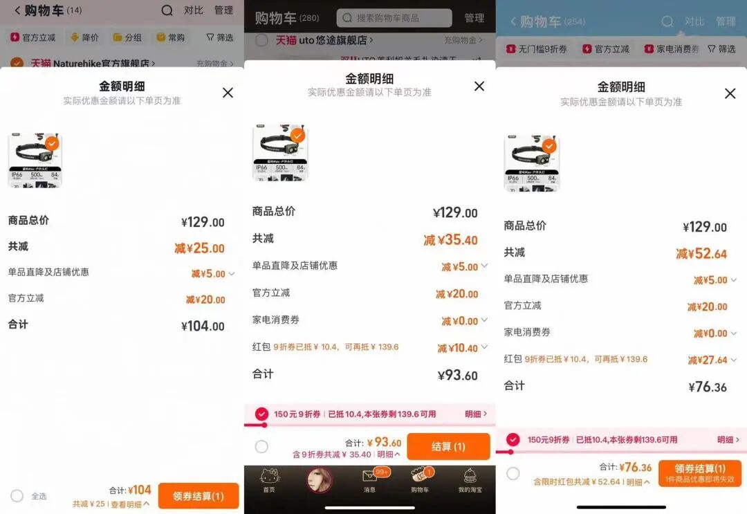 类似现象并不少见,消费者小白(化名)今年8月底购买的一款保健药品实付267元;“双十一”期间叠加19元红包后,如果不叠加88VIP红包,价格反而为270元;同期购买的美的手持挂烫机,当时价格84.15元,如今即使用上九折券也要89元,比之前更贵。