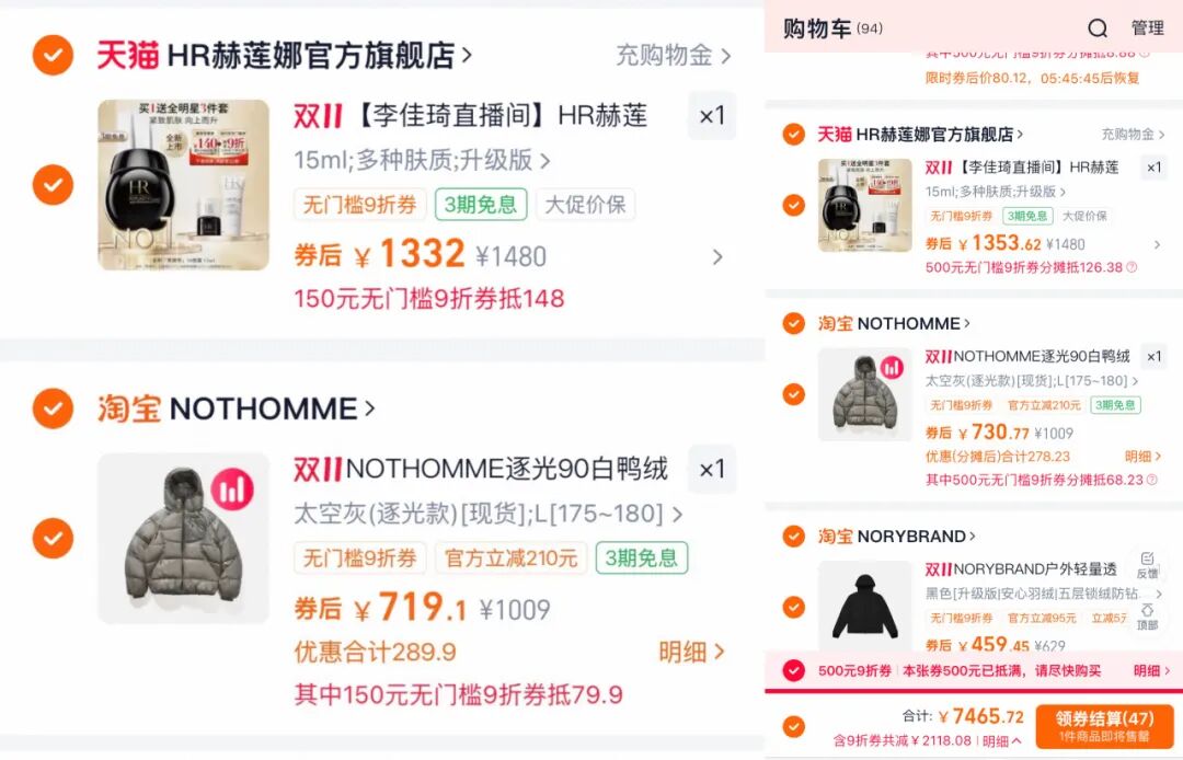 更令人哭笑不得的是,买得越多可能越贵,“凑单”越凑越贵——一件羽绒服单独购买719元,凑单后涨为730元;一盒护肤品单独购买1332元,凑单后涨为1353元。