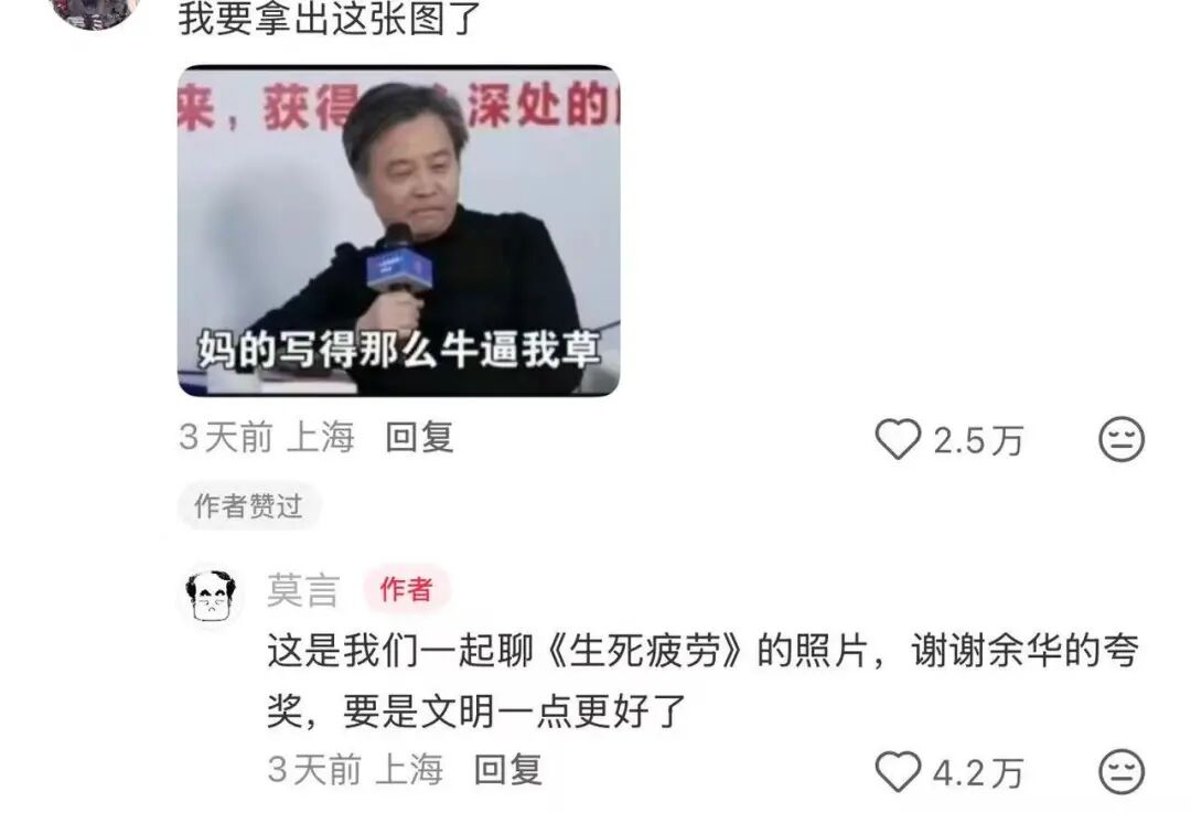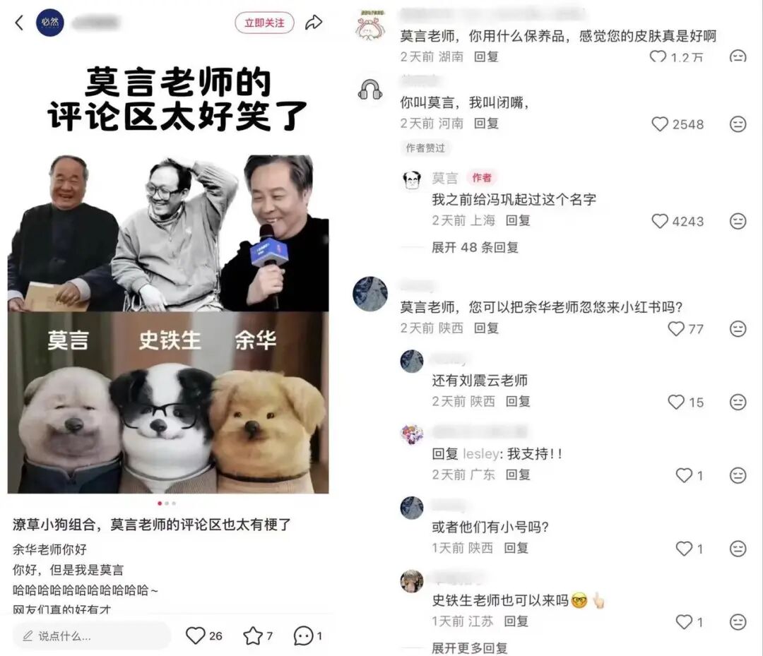 诺贝尔文学奖得主莫言在小红书评论区回复网友发的余华表情包时,这条评论打破了所有人对“严肃文学家”的刻板印象,随后视频也火爆出圈。