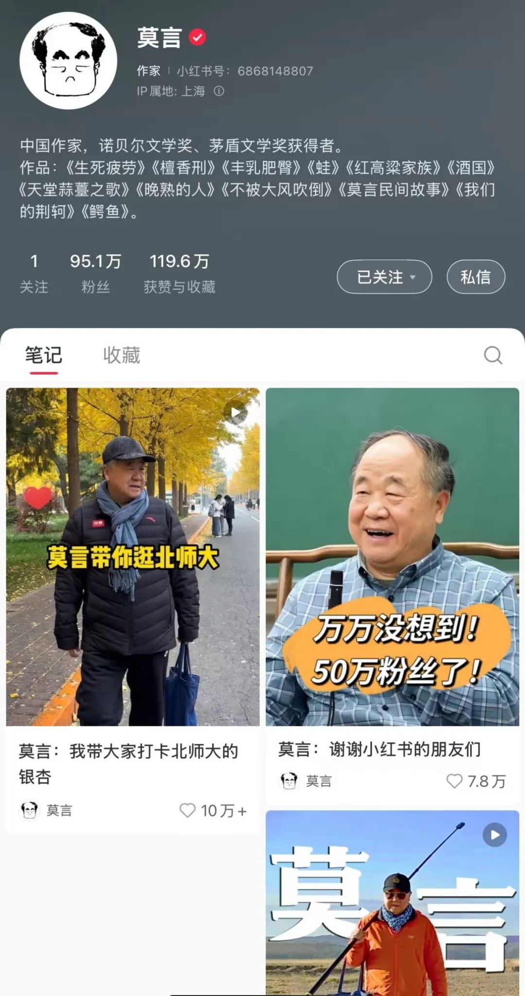 11月11日,莫言在小红书发布首条视频“小红书,我来啦”。短短几天,粉丝就超过95万,视频的点赞量也是轻松10万+。