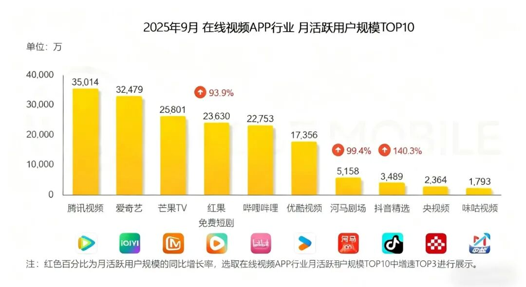 而撑起这一切的,是红果短剧惊人的流量:QuestMobile数据显示,红果短剧在2025年9月的月活用户已达2.36亿,同比增长近94%,跃居短剧类应用排行榜首位。其月活规模不仅略高于哔哩哔哩的2.27亿,也超过了阿里旗下优酷的1.73亿。与排名前两位的腾讯视频和爱奇艺相比,红果分别相差1.13亿和8849万月活;而与第三名芒果TV的差距,仅剩2171万。