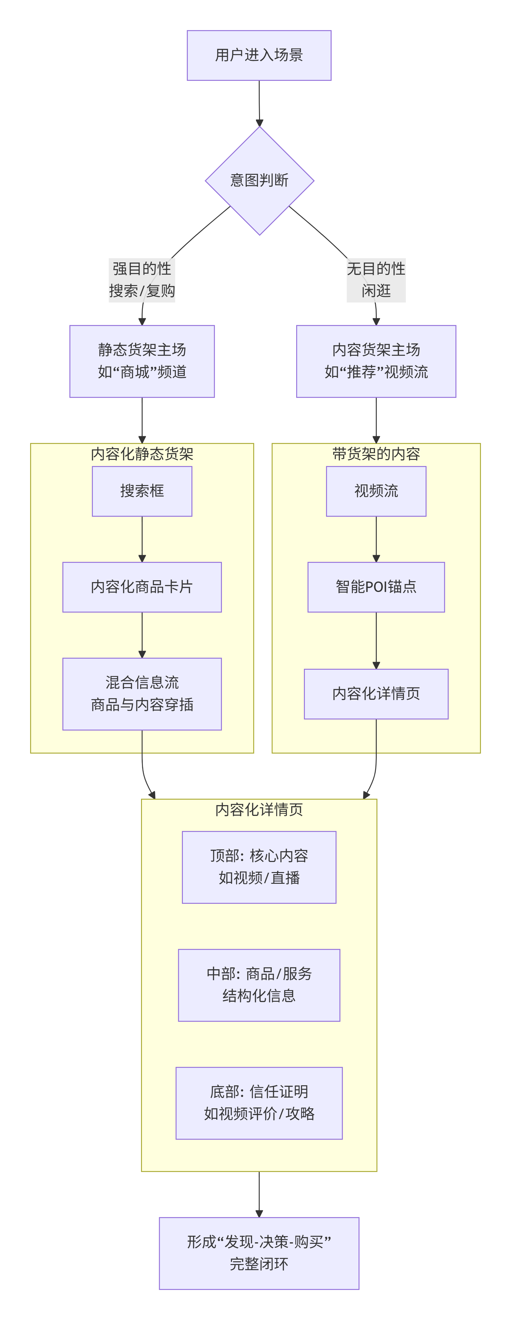 - 后端是“内容化、分层级的货架”(如商城频道、商家页面),用于承接有进一步比较意愿的用户,试图在平台内完成闭环。