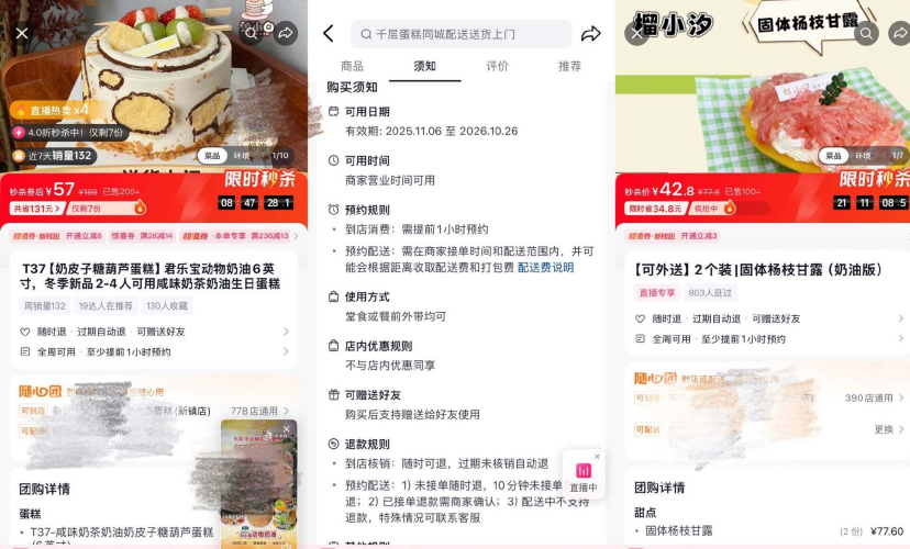 不过,在刷抖音美食时,晴子发现,自己看中的“奶皮子糖葫芦蛋糕”有团购,且标注“随心团”字样,“6英寸冬季新品,领券后才50多元,比日常团购低不少。而且可到店或可配送,过期未核销自动退。”