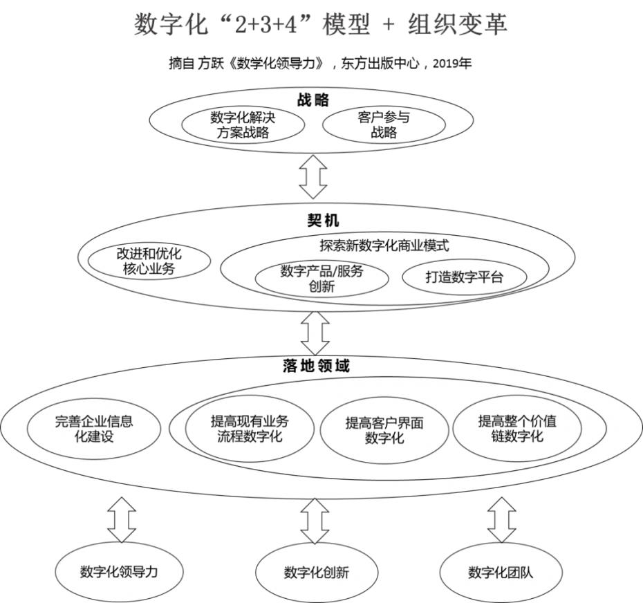 为了落地,文章提出了一个行动框架:数字化“2+3+4”模型+组织变革。