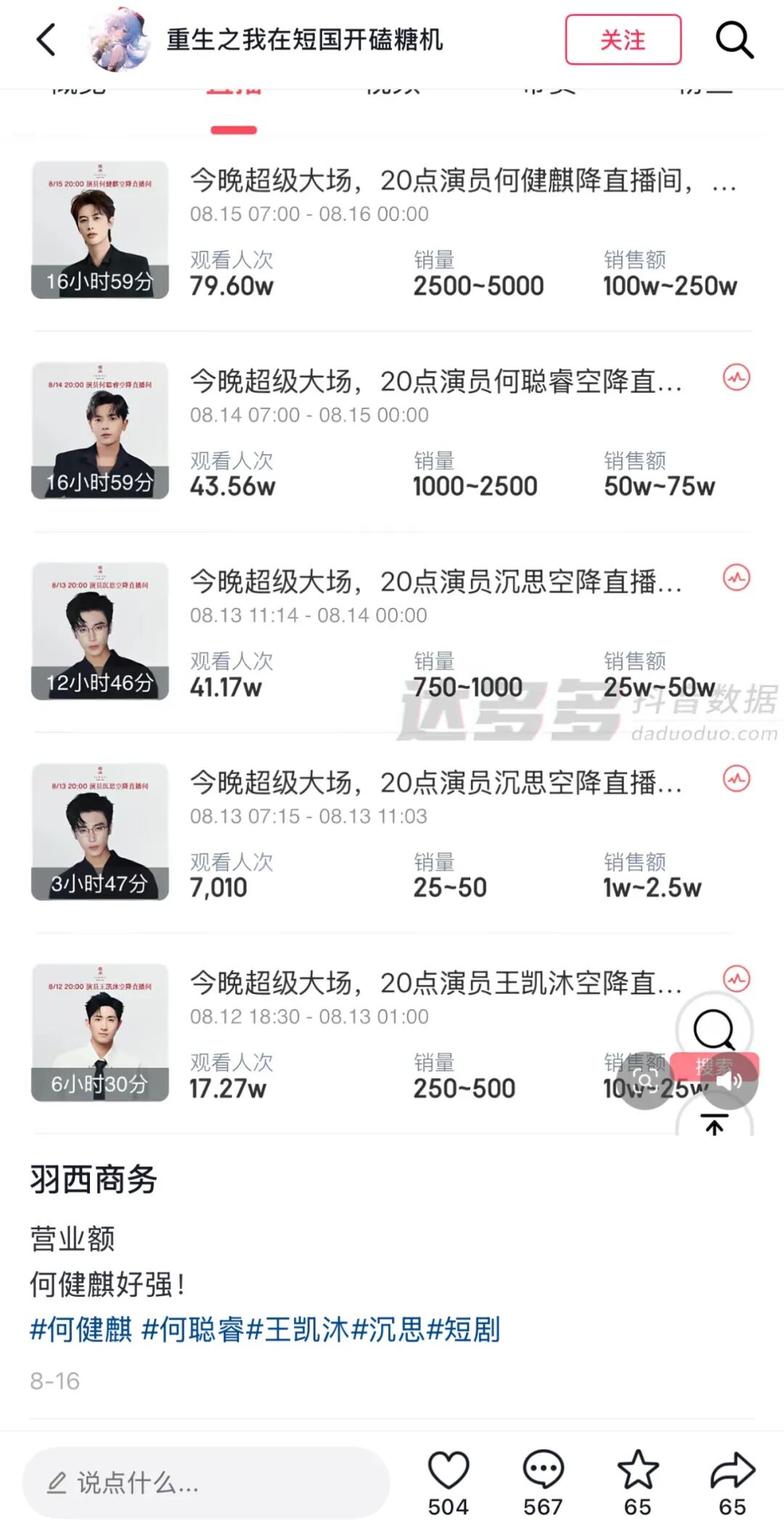 此外,「克劳锐」还关注到一场短剧男演员的集体带货实验。今年8月,羽西品牌一次性邀请何健麒、黄浩雯、王凯沐、沉思、何聪睿、蓝博、王道铁等7位风格迥异的短剧男演员,采用分时段轮播的形式开展集体带货。