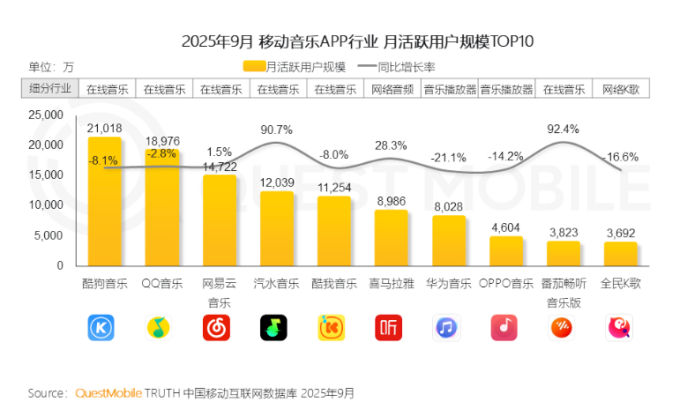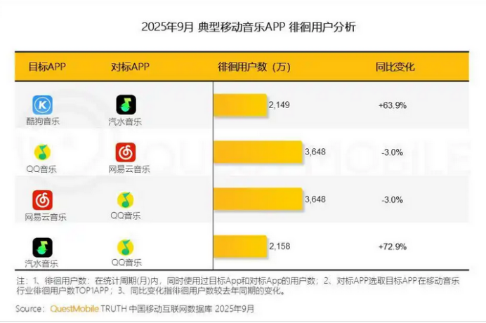 QuestMobile数据显示,2025年9月,尽管汽水音乐与QQ音乐、网易云音乐的“徘徊用户”(即同时使用的用户)规模同比激增超70%,后两者的月活大盘却保持稳定,汽水音乐难以实质性分流头部两家的核心用户。