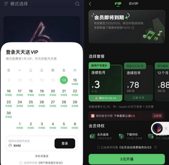 因此,为了用户增长,“免费”成了汽水音乐活字招牌。新用户每日登录即可获得长达半个月的会员体验,后续连续包月费用也低至8元,价格显著低于市场主流。应用界面上,“免费”字样被置于醒目位置,并设有专属福利中心,通过看广告听歌、红包雨、盲盒开奖等游戏化运营手段,持续强化免费属性。