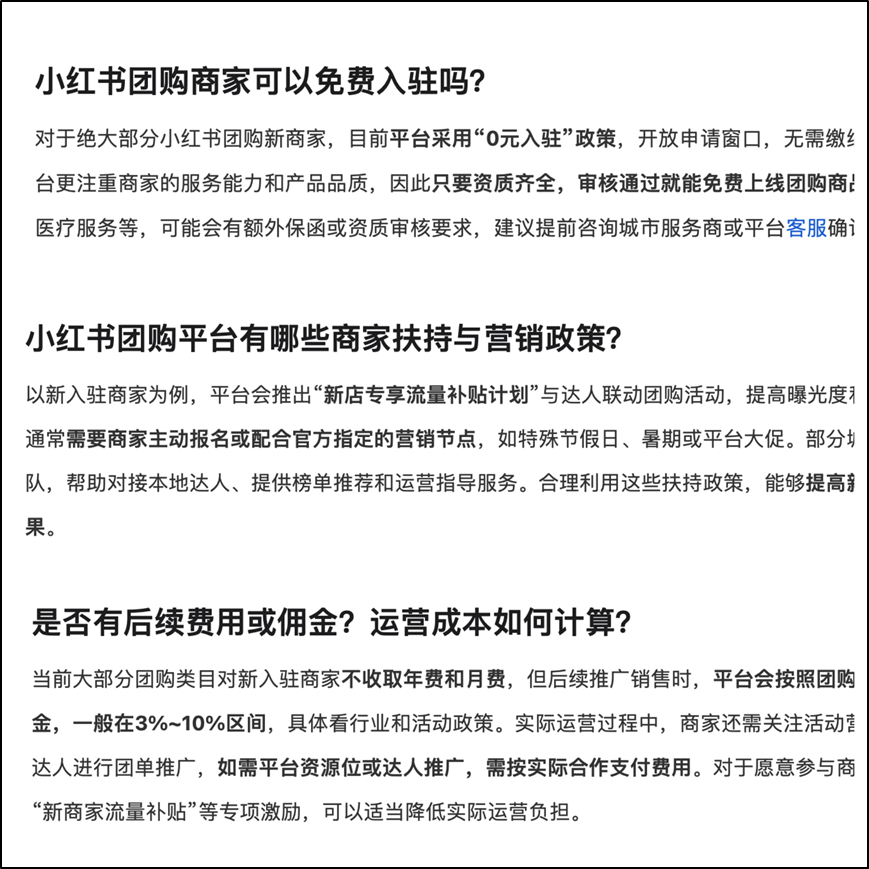 据36氪报道,同年9月起,小红书进一步开放餐饮团购至全国49个核心城市,并实施0.6%的技术服务费与暂免保证金政策,显著降低了商家的入驻与经营门槛。