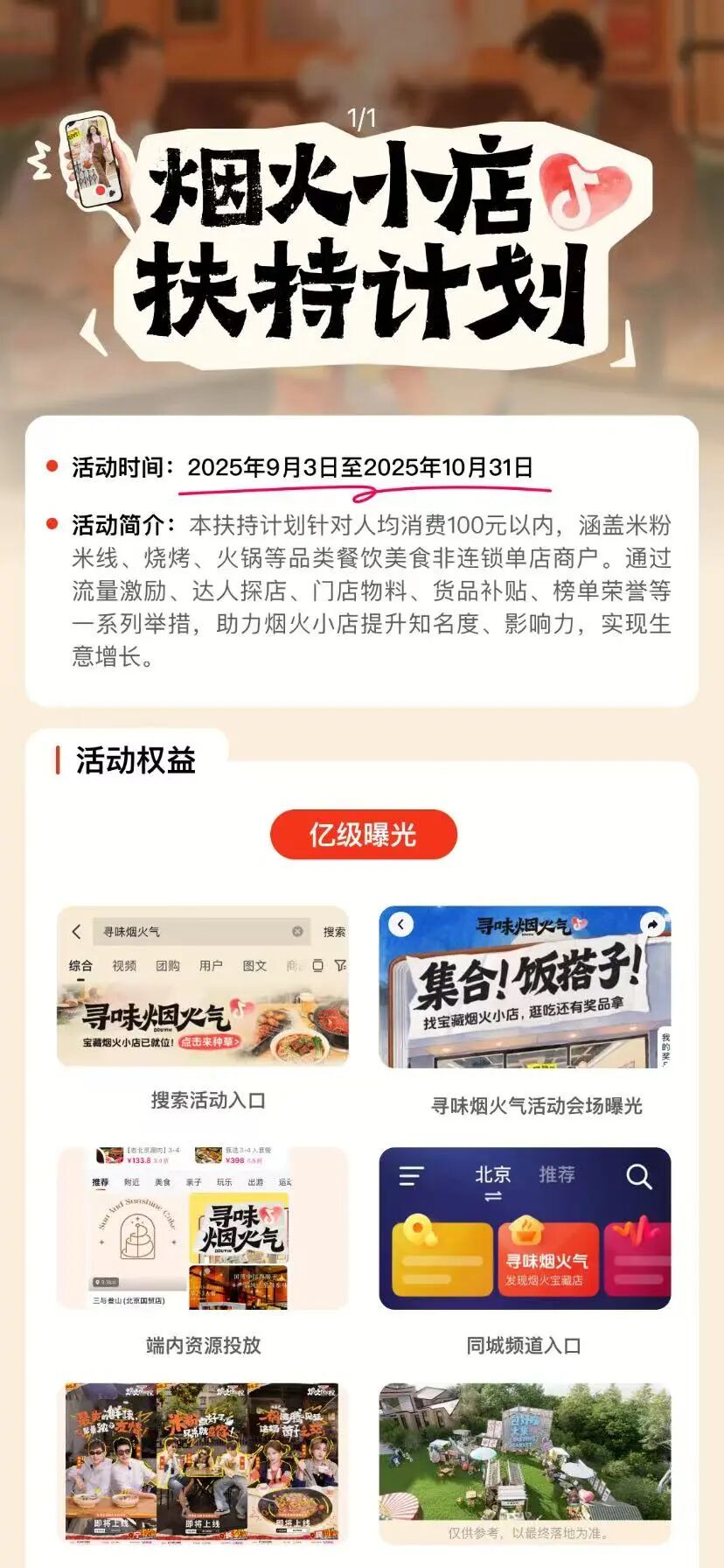 抖音也迅速跟进,在“高德扫街榜”发布的同一天,抖音生活服务推出“烟火小店扶持计划”,从流量激励、达人探店、门店物料、货品补贴及榜单荣誉等多方面,助力中小餐饮商家提升经营。