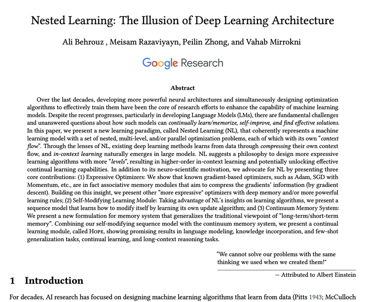 但在 Google 最新发布的 52 页硬核论文《Nested Learning: The Illusion of Deep Learning Architectures》(嵌套学习:深度学习架构的幻觉)中,研究团队试图告诉我们,这其实是一种幻觉,是我们人为制造的自我设限。