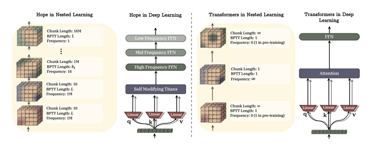 基于这个大胆的假设,Google 团队提出了一个名为 HOPE 的新框架。他们并没有简单地堆砌参数,而是试图从底层逻辑上重构 AI 的“大脑结构”,让它不再是一个出厂即固化的工具,而是在每一次交互中都能微调自己、拥有“快慢记忆系统”的动态生命体。